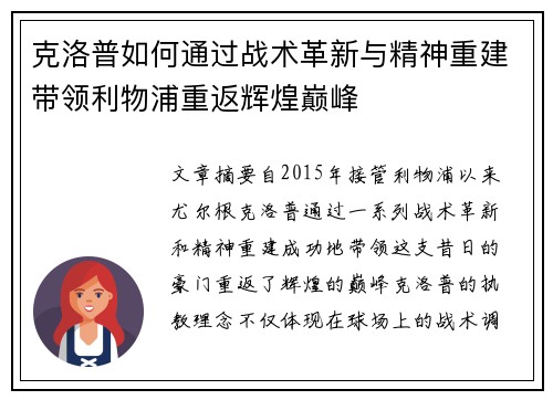 自2015年接管利物浦以来,尤尔根·克洛普通过一系列战术革新和精神重建,成功地带领这支昔日的豪门重返了辉煌的巅峰。克洛普的执教理念不仅体现在球场上的战术调整,还体现在队员心理的调动与凝聚力的构建上。在这篇文章中,我们将从四个方面来探讨克洛普是如何通过战术革新与精神重建实现利物浦的复兴。首先,克洛普的“重压进攻”战术彻底改变了球队的进攻风格;其次,他通过高效的防守体系将球队的防守能力提升到新高度;第三,他通过培养年轻球员和增强阵容深度,进一步丰富了球队的战术选择;最后,克洛普对球员心理的重塑和精神层面的提升是球队成功的重要因素之一。通过这些多方面的举措,利物浦成功地从困境中崛起,重回了欧洲和英格兰的足球巅峰。